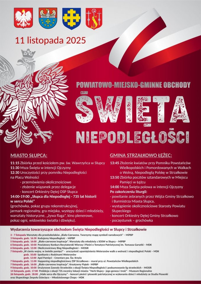 „11 listopada będziemy obchodzić 107. rocznicę odzyskania niepodległości przez Polskę. Z tej okazji serdecznie zapraszam na Powiatowo - Miejsko - Gminne Obchody Narodowego Święta Niepodległości. Spotkajmy się w tym dniu, aby w zadumie i refleksji oddać hołd tym, którym zawdzięczamy odzyskanie państwowości i życie w wolnej Ojczyźnie. Wielu z nich poświęciło dla wolnej Polski swoje życie. 11 listopada bądźmy razem i wspólnie świętujmy Niepodległość. Szczegółowy program obchodów na plakacie poniżej.” – poinformował na swoim profilu na facebooku burmistrz Jacek Szczap.