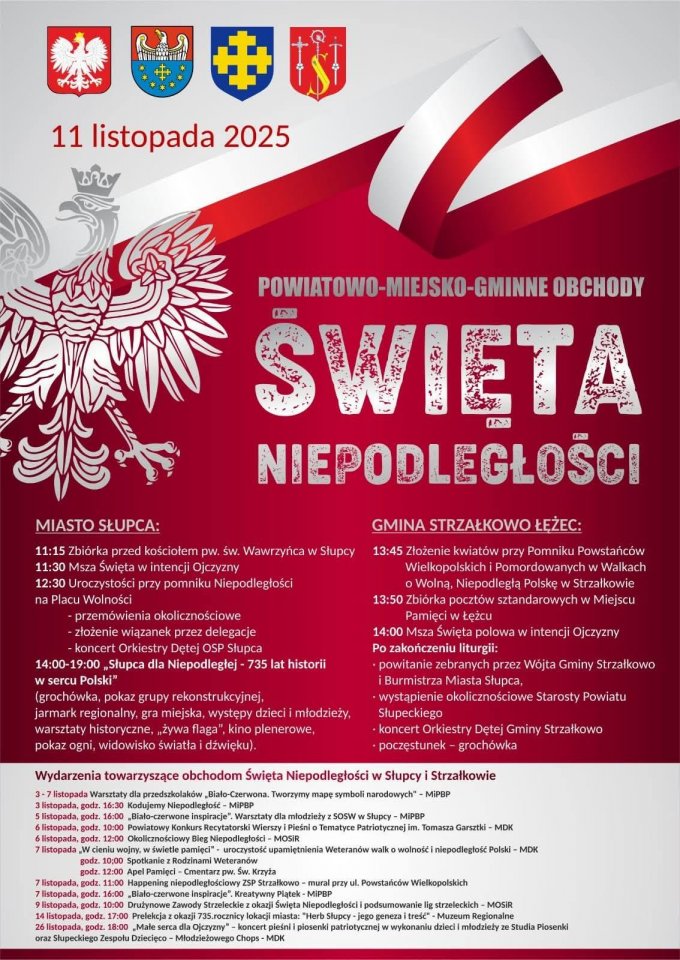 „Nowe flagi już powiewają na zrewitalizowanym Rynku w Słupcy. Serdecznie zapraszamy wszystkich mieszkańców i gości do wspólnego świętowania 107. rocznicy odzyskania przez Polskę niepodległości. 11 listopada spotkajmy się na słupeckim Rynku, by razem uczcić ten wyjątkowy dzień – pełen historii, dumy i wspólnoty. W tym roku obchody będą miały szczególny charakter – zostaną połączone z uroczystym otwarciem zrewitalizowanego Rynku w Słupcy. Szczegółowy program wydarzeń znajdziecie na plakatach poniżej. Niech 11 listopada będzie dniem radości, jedności i wdzięczności za wolną Polskę! #Słupca #Niepodległa #11listopada #ŚwiętoNiepodległości” – poinformował na swoim profilu na facebooku burmistrz Jacek Szczap.